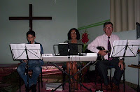 E foi muito bom. O culto foi realizado na sala dos jovens,que se localiza junto à fachada da frente da igreja e que estava decorada de forma discreta e agradável.(Há uma fachada ao fundo, por onde se ingressa na nave principal.)