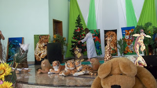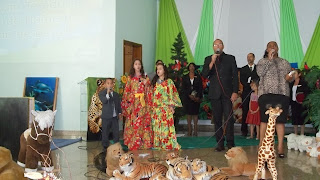 Interessante que o culto teve um sermão musical pela professora Jardelina, com a participação de grupo de louvor (composto por adultos e crianças) e da banda de nossa igreja. A irmã Jardelina lembrou como devemos "peneirar" nossas ações - vigiando nossas mãos, pés, olhos, ouvidos. Houve uma representação sobre Adão e Eva no Jardim do Éden. Eva não vigiou as suas mãos e pés e tomou do fruto proibido.
