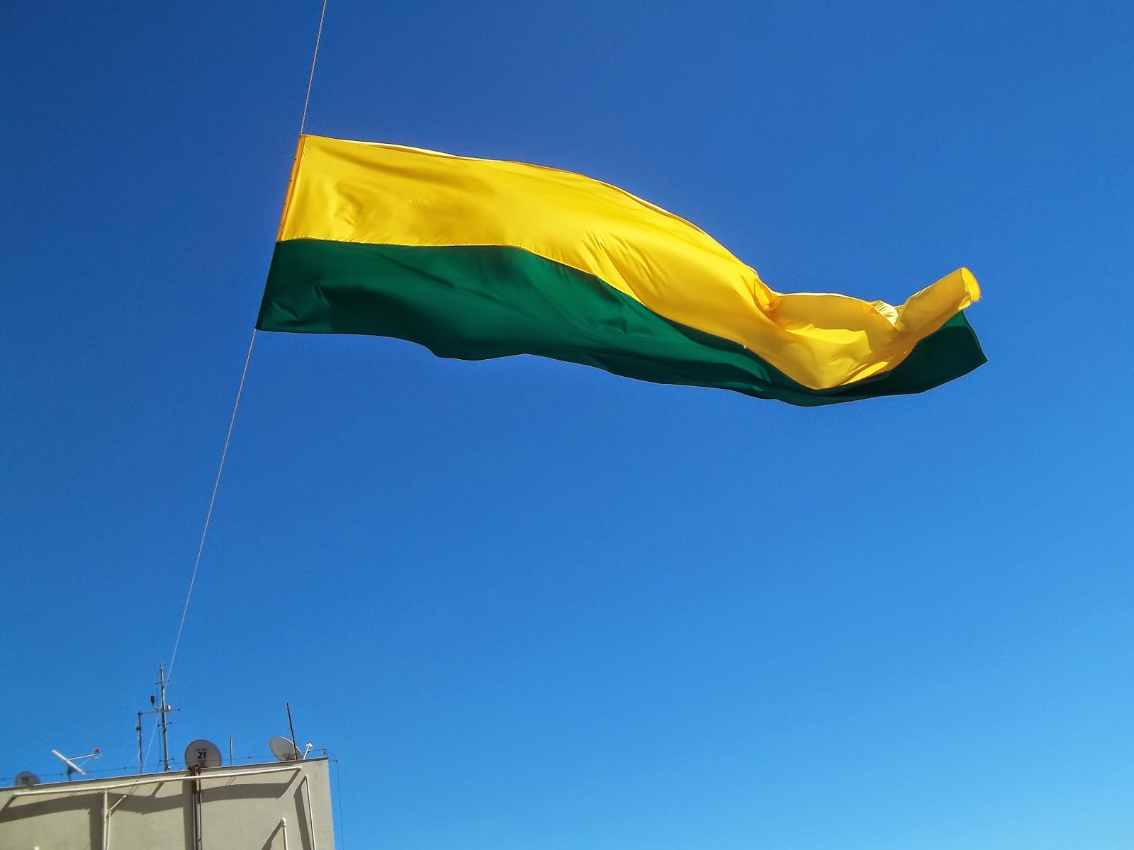 Olhei e vi uma flâmula com as cores verde e amarela em xadrez, lembrando a bandeira do Brasil, que apresenta também estas cores. Mas não estava no bloco fronteiro e, sim, flutuando entre os dois blocos. Olhando mais detidamente, vi que estava suspensa em uma corda fina.