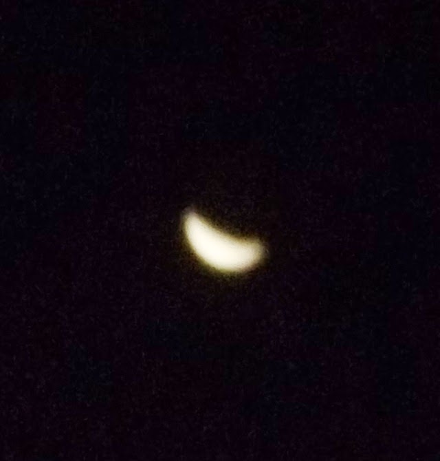 Achava que o eclipse previsto seria às 4h45, mas acordei uma hora antes - felizmente. O eclipse iniciou-se pelas 3h45. A lua, nesse horário, não tinha mais o formado de lua cheia mas de crescente, diminuindo cada vez mais, de forma que o formato em C tornava-se cada vez menor.